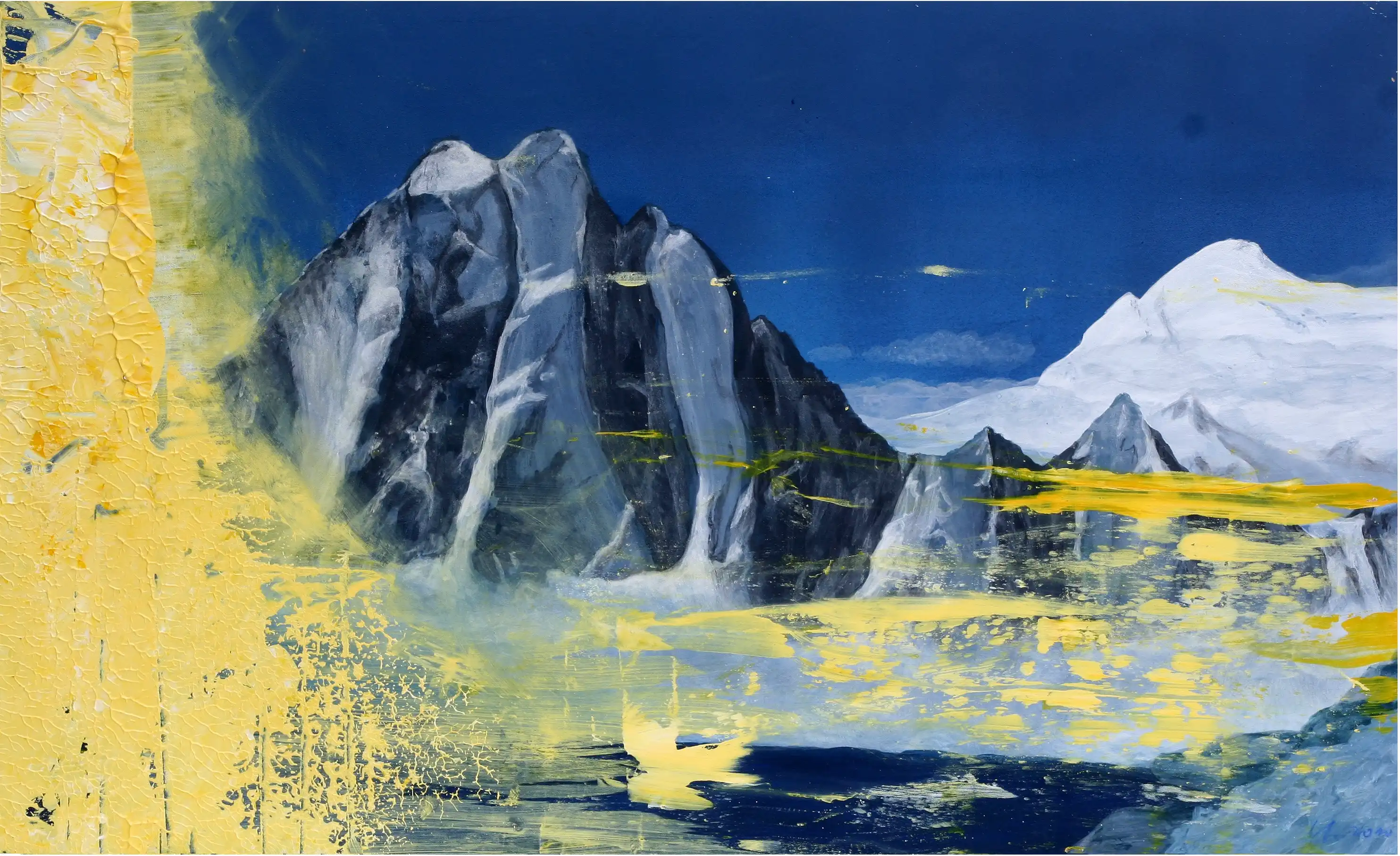 Ein monumentales Bergpanorama, in dem sich die ewige Kraft der Natur in einem spektakulären Farbenspiel aus Gelb und Blau manifestiert.